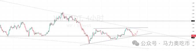 标一个现货代码wif,小级别连续下跌价格已经触及支撑,而且空头开始缩量,目前也是强支撑位置,可以现价1.57分批买入现货,留一个补仓位置,预期涨幅30%以上