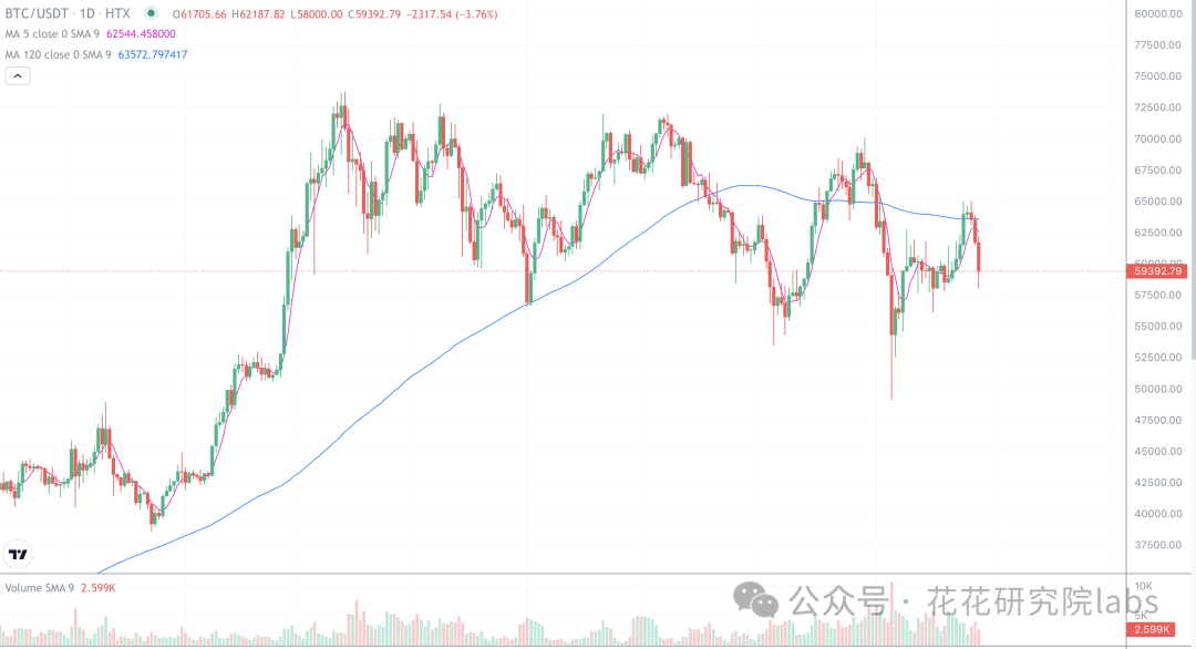 这波下跌我们是预测到了,提示跌破63500就有回踩62000的风险,但实际的跌幅超过了我们的预期,主要是昨天门头沟在bitgo的三万枚比特币动了,有可能是已经赔付给投资者,受到这个消息的影响,市场大跌,目前已经跌破六万,我们短线操作也已经触发止损,经过这么一跌,花哥认为市场短期想要上涨是很苦难了,要么就在57000-62000区间震荡,要么在向下探底,建议观望一段时间,耐心等待机会。