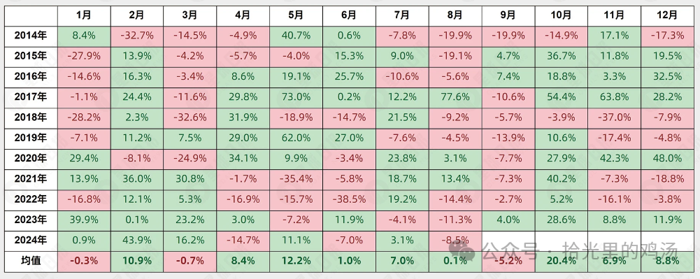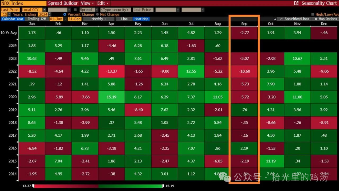 这一规律不仅体现在加密市场,长牛的美股同样存在这一规律,过去 10 年的纳斯达克指数的月均表现如下图所示,十年内只有两年是上涨的,多数情况下都发生了一定程度的下跌。
