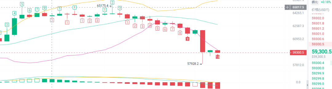 今日行情分析:从K线上看,1小时级别有止跌现象,下影线58000不再次跌破就确认为短期底部,4小时,12小时级别为下跌趋势,日线级别刚进入下跌趋势,日内高空为主。日内压力位62000,支撑位56200