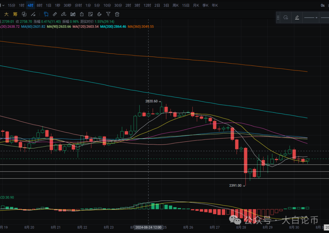 以太日线昨日收出十字星 最高上插至2595附近 最低位于2505附近 收线在2530附近 上方压力位于MA7附近 形成突破则可看至MA30附近 MACD多头缩量 有形成死叉的迹象 四小时下方有多次测试2430附近 形成支撑 回踩可在附近进行接多 上方压力位于MA7均线附近 突破则可看至MA30附近 MACD震荡走平 短线给至2430附近可进行接多 反弹目标可看至2465-2500附近