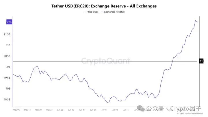 自 8 月初以来,Tether 交易所储备一直呈上升趋势。这表明市场购买力不断上升,但很难判断加密货币市场价格何时会开始上涨,但指标显示仍有上涨空间。