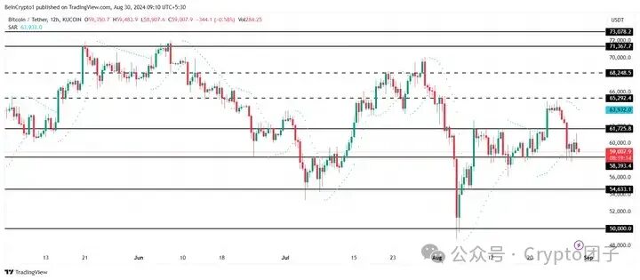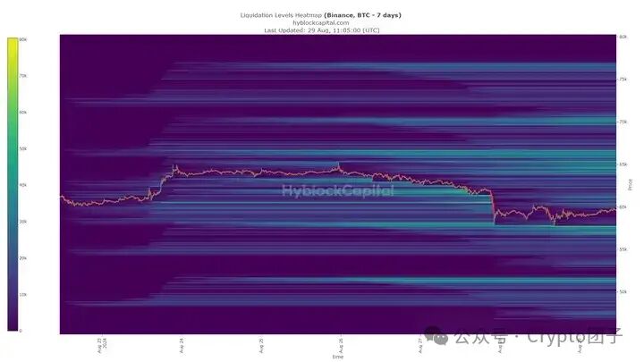 8 月 27 日,比特币经历了多次短期流动性集群暴跌,迅速跌至 5.8 万美元的流动性池。此后,比特币价格趋于稳定,但流动性是价格走势的关键驱动因素。