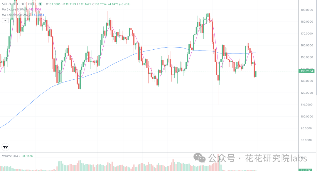 sol跌破了136的颈线支撑,日线局部形成双顶,短线反弹减仓避险,这里双顶形成了,恐怕还有下探空间!