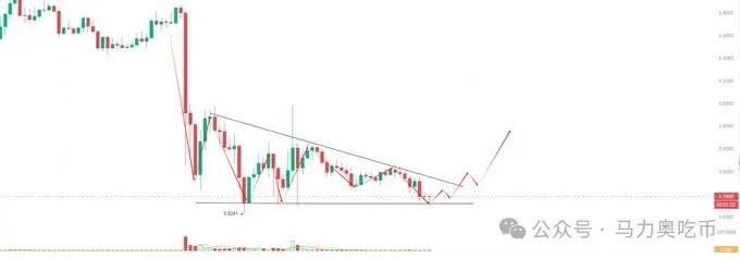 Ton看涨信号来了,前几天是走了一个下降楔形但是未能突破再次跌回低点位置,目前这里判断出两个形态,一个是下降三角形看跌形态,另外就是底部三角形反转看涨形态,但是仔细研究了一下,发现底部三角形的概率很大