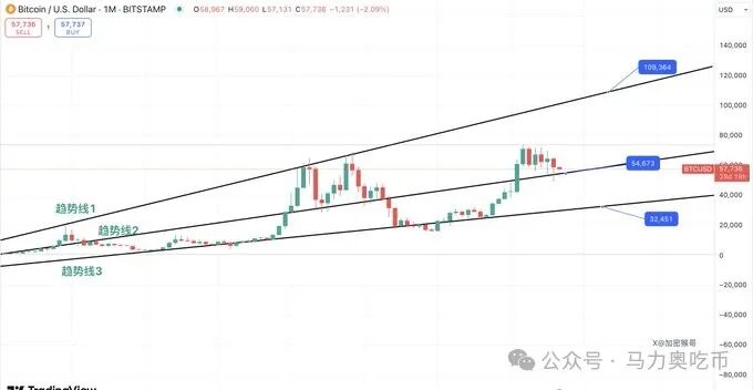 做了个月线趋势图,至今都准确的呈现了比特币在回撤中的支撑位置,在前几次回撤中,都均以验证。