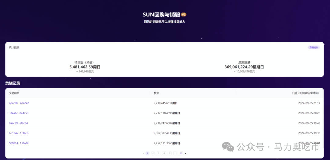 另外孙哥的Sun币于昨天开始了回购。8月底孙宇晨就曾表明,会把Sun上100%的收益用作回购代币并销毁,而昨天他正式宣布回购开始。
