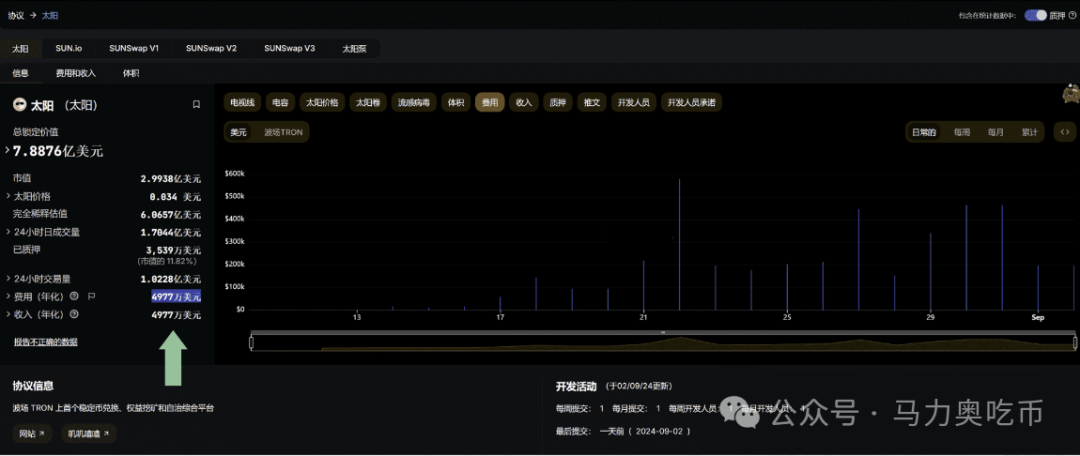 不过可惜的是,市场早已Price in了这个利好,目前币价没什么波动。那这个Sun项目的收益还挺高的,相当于年化5000万美金,不过前提是这个交易量能维持住当前的态势。