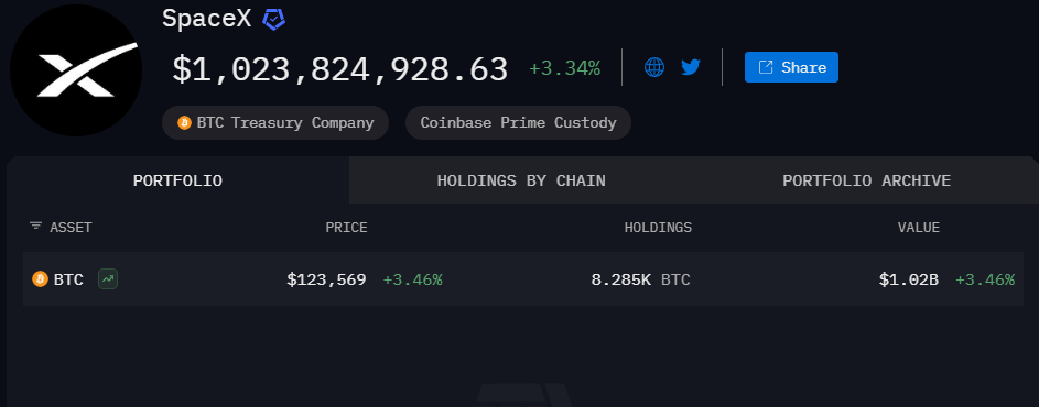 SpaceX 持有的 BTC 价值已突破 10 亿美元
