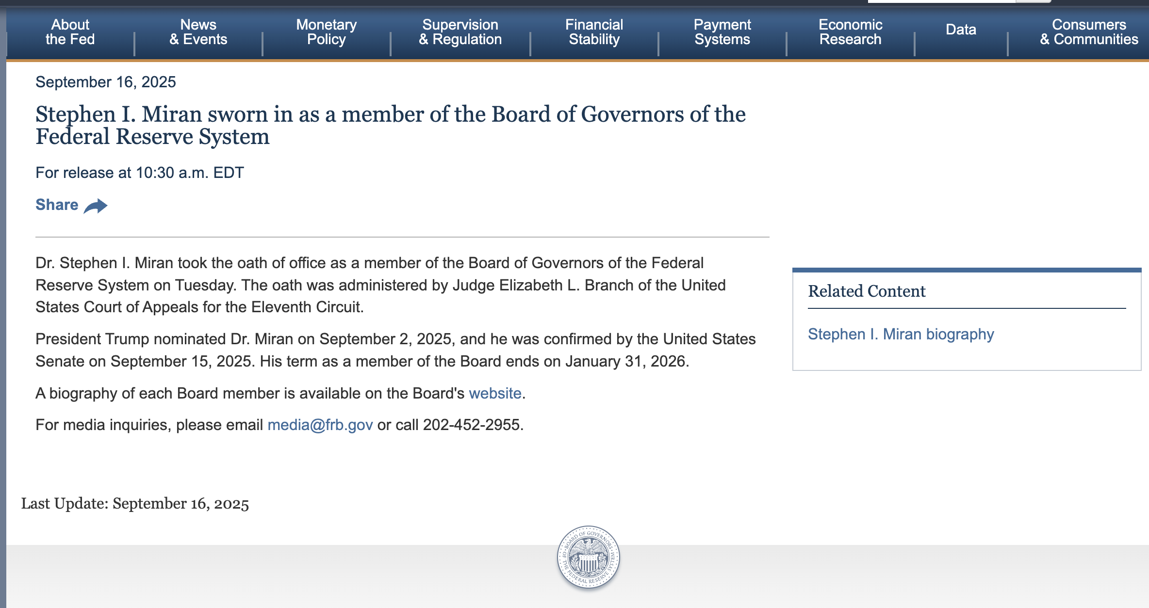 美联储发布公告,斯蒂芬·米兰宣誓就任美联储理事,理事会成员任期将于 2026 年 1 月 31 日结束。