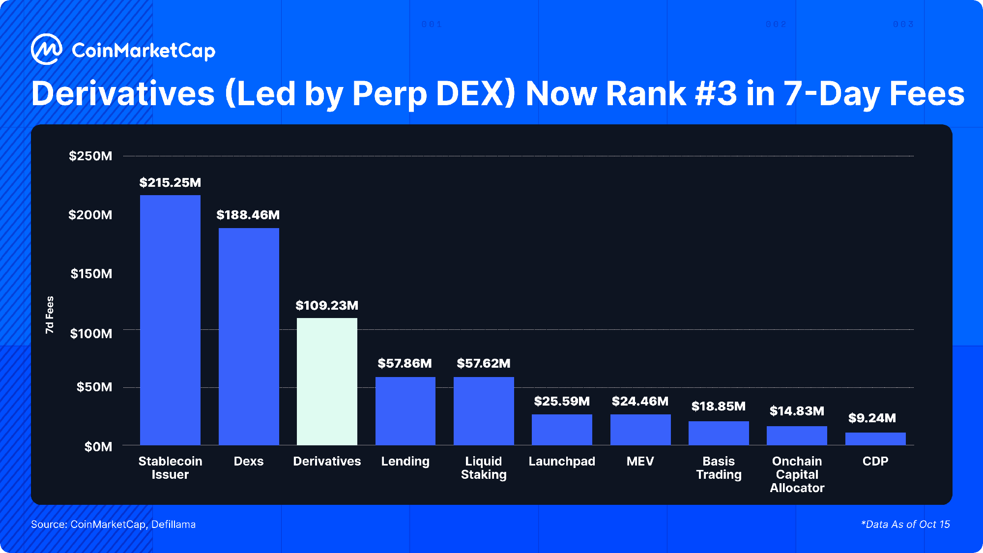 据 CMC 数据,在过去 7 天,以 Perp DEX 为代表的衍生品协议捕获费用达 1.09 亿美元,仅次于稳定币发行商(2.15 亿美元)和 DEX(1.88 亿美元)。此外,借贷协议捕获了 5,786 万美元费用,流动性质押协议捕获了 5,762 万美元费用,而 Launchpad 赛道位列第六位,捕获了 2,559 万美元费用。