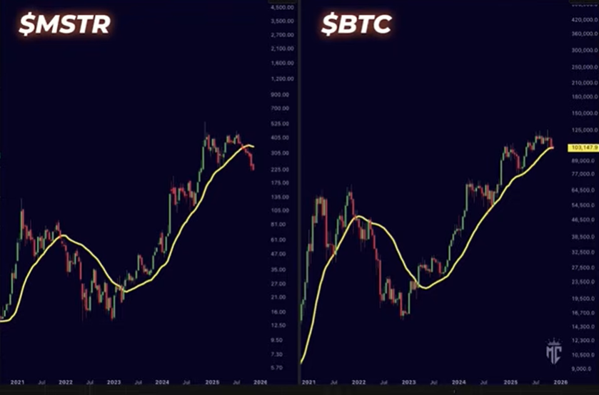虽然微策略并没有出售比特币,但现在社交媒体上有很多推文将 MSTR(微策略股票代码)和比特币走势进行对比,尤其是围绕关键的 50 周均线。MSTR 此前一段时间已走熊,在同一周期框架下,比特币似乎正在跟随其走势,就像上一个比特币周期那样。
