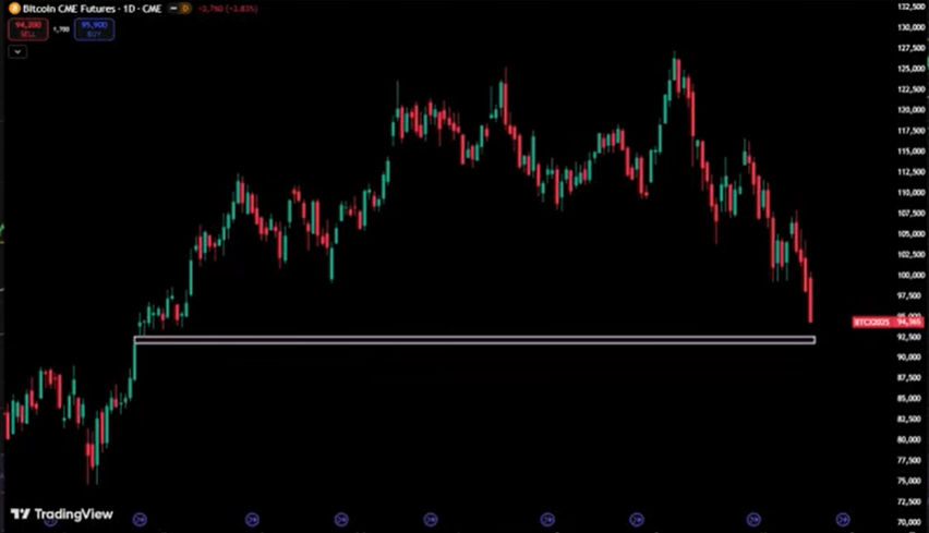 随着比特币价格下跌,现在很多人猜测下一个目标可能是 92,000 美元。没有其他复杂原因,只因上半年关税闹剧期间,曾形成过一个 CME 期货缺口 —— 期货缺口被填补的概率高于 99%。