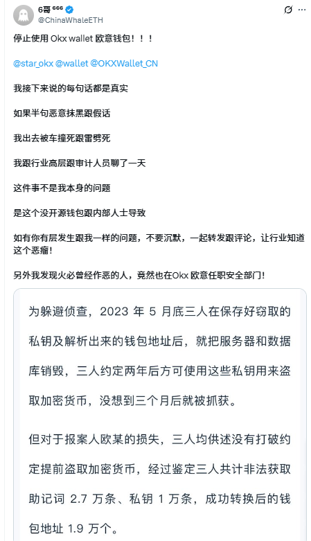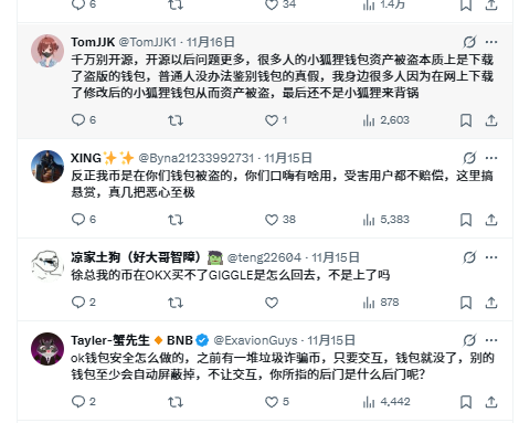 说实话,这种事在徐明星发推悬赏之前,其实解释都属于浪费笔墨。这不是不是给OKX公关,当然,内部人员作案理论上是有可能的,但也要看行为模式是否匹配。一般来讲,内部作案都是大额、机构优先,不会盯着咱几十个E这点仨瓜俩枣,我当时就盲猜是自己的问题。到现在舆论发酵后,跟我判断的差不多。没有任何一个安全团队提供有暗门、可复现的证据。最后调查结果都显示是用户终端的恶意应用感染、授权劫持和助记词泄露。我没想到的事是,就这破事,徐明星也得跑出来发个推文----这让我想起来当时候何一说币安人生,CZ买Aster的推文...怎么说呢,就有种我割了你韭菜,还要在你前面耀武扬威的感觉。然后我继续在评论区吃瓜,突然又觉得,该。其实,这件事暴露的不是钱包的安全问题,而是普通人在加密世界里承担的责任边界。只要选择自托管,你就把所有后果收回自己身上。以前是银行替你兜底,现在是你替自己兜底。事情出错时,不会有人提醒你,也不会有人替你追回。