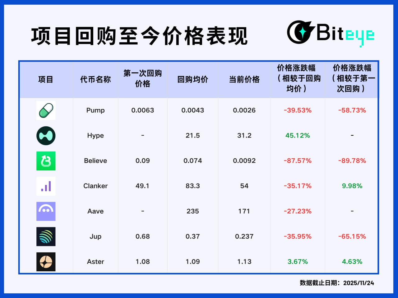 Biteye:代币回购表现最好为 Hype ,相比于回购均价上涨了 45.12%