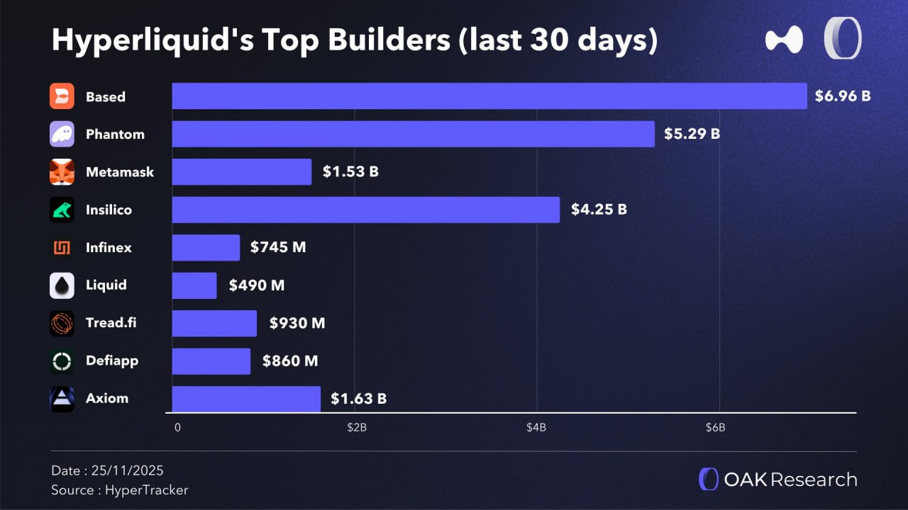 据 OAK Research,自 10 月以来,Based 已成为 Hyperliquid 上累积收入最高的 Builder,达 1,150 万美元。在过去 30 天,Based 处理的交易量超过 69.6 亿美元,Phantom 为 52.9 亿美元,Insilico 为 42.5 亿美元。Based 由 Ethena 支持,优势在于直接连接 Hyperliquid 的交易界面、易于使用的移动应用、信用卡和 HIP-3 市场整合。