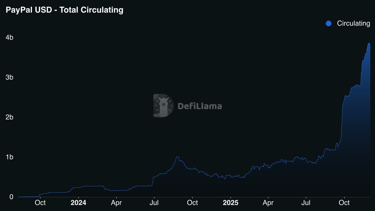 据 DeFiLlama 数据,PayPal 稳定币 PYUSD 供应量急速增长,从 9 月的 12 亿美元市值飙升至当前的超过 38 亿美元。PYUSD 已是第六大稳定币,过去一个月增长超 36%。