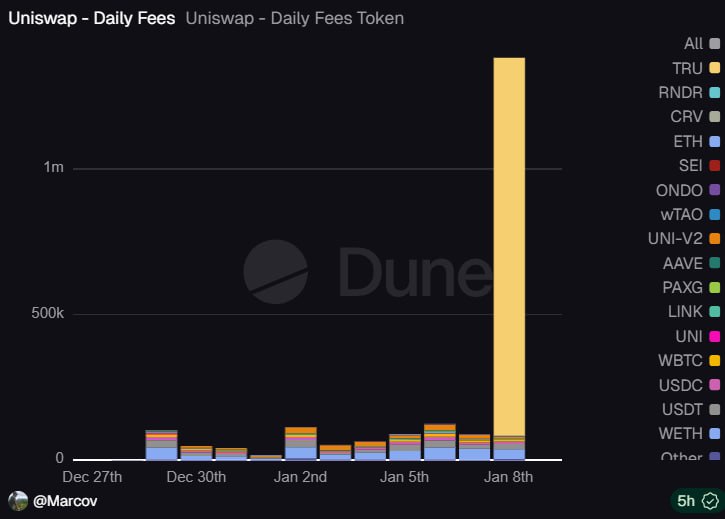 据 @marcov_91 数据面板,1 月 9 日,Uniswap 单日费用捕获收入达 140 万美元,创下历史新高。然而,值得注意的是,在 Uniswap 费用捕获的标的中,昨日被黑客攻击的 Truebit Proctocol 代币 TRU 贡献了约 130 万美元。