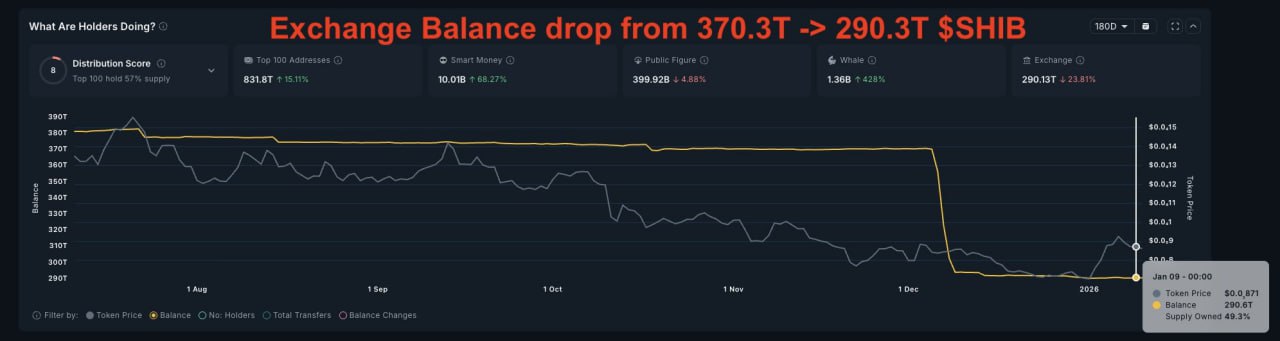 SHIB 鲸鱼积累:交易所净流出 80 万亿枚 余额降至 290.3 万亿