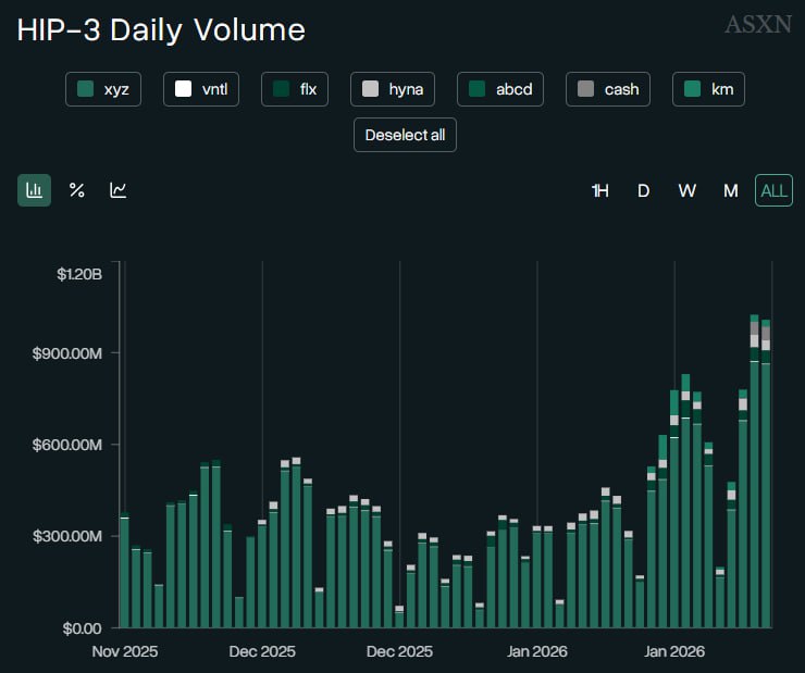 Hyperliquid 的 HIP-3 市场交易量已连续两个单日超过 10 亿美元,为历史首次