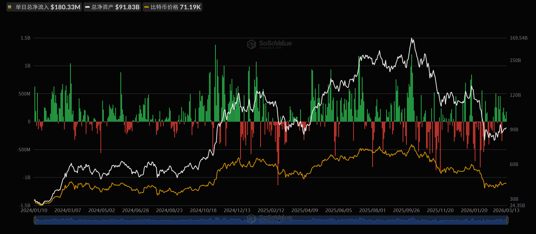 3 月 13 日比特币现货 ETF 总净流入 1.80 亿美元
