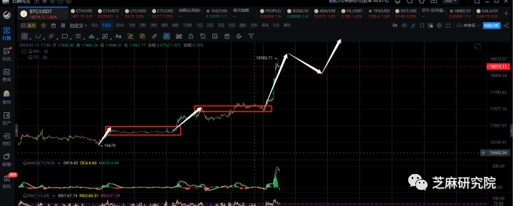 4小时级别,当前4h级别的反弹应该是还没有结束的,应该会继续向上走,但是不太确定最终到哪里。短线来看,4小时突破18500的概率还是比较大的,看是否到19100附近吧。走完以后会再给个4小时级别的回调,下一笔4小时回调预期跌破16333的概率比较小,很大的概率还是维持在17000以上。