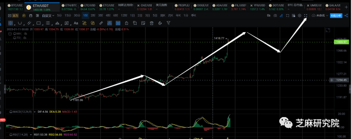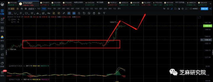 以太的日线目前已经触及到维加斯通道的压力了,上方1420是压力。能否突破压力拉到1450,目前不确定。