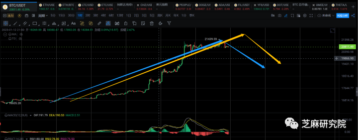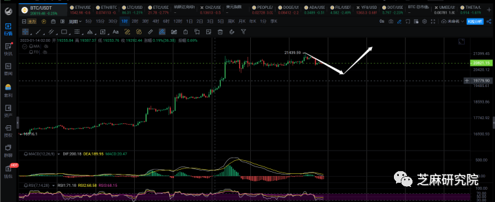 1h级别,这里如果1h回调成功走出来的话,关注20000附近的支撑情况,能够在20000撑住的话,还能再往上走一笔1h反弹去21500附近。