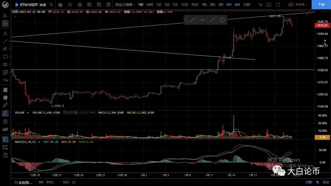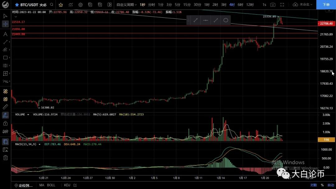 大饼昨日回踩未破22500支撑后震荡上行,高位触及23267一线迅速回落,但力度不大,随后行情继续上行收回失地再次破位前高至23339一线,恭喜跟上昨日思路的朋友,目前币价在22740附近运行,小时级别走出头肩顶结构,macd空头运行双线死叉向下,如按照预期走势来看行情还没有回踩到位,四小时级别级别行情破位前高上方受趋势线压制回落受阻明显,四小时形成顶背离结构,多头力度减弱,目前行情虽走出回踩但力度不大,整体依旧保持多头趋势运行于上升通道内,但短期多单不建议进场,目前先关注回踩力度再逢低做多,不破前高的话可以短空,上方压制23000-23300,下方支撑22500-22000