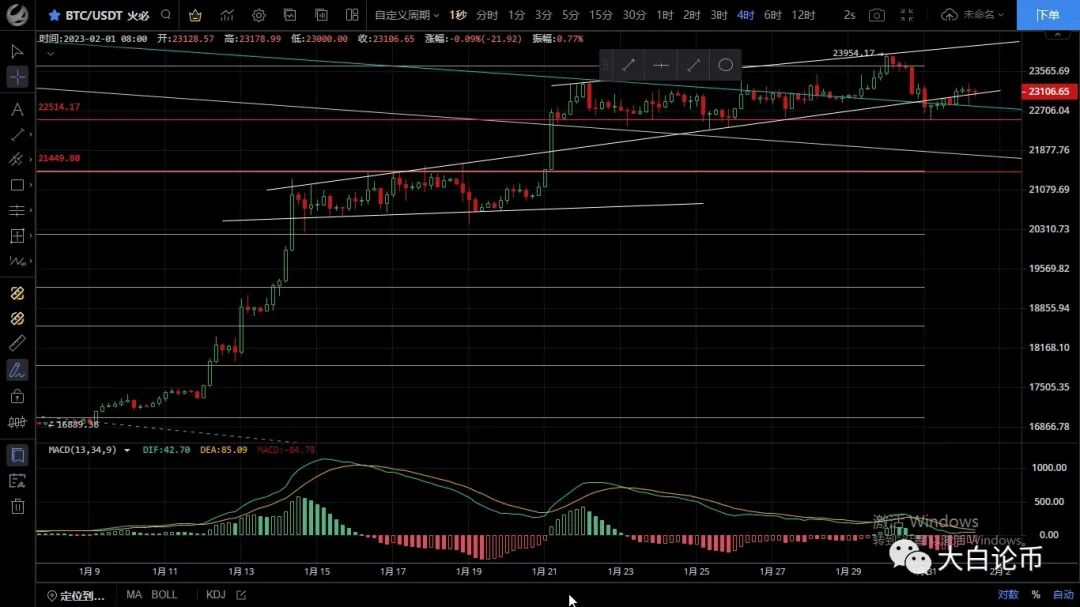 大饼昨日未能跌破22500支撑,白盘一路震荡上行,凌晨行情回踩至22817一线后迅速反弹收回失地,恭喜跟上昨日思路的朋友,目前币价在23085附近运行,四小时级别行情整体处于区间震荡,上下支撑阻力都挺强,预计白盘不会有太大波动,重点关注晚间加息,大概率是利好,但消息落地会不会回调是不确定的,注意风控,目前短期行情有回踩需求,但力度有限,总体还是有继续上行的趋势,思路上建议逢低做多为主高空为辅,上方压制23400-23800,下方支撑22800-22300