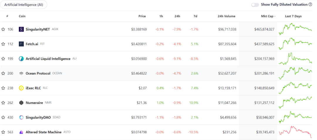 本文认为,加密货币的发展在本质上是技术驱动金融的发展结果,底层是由区块链技术支撑,上层是DeFi等众多应用驱动。随着加密市场的发展,关注宏观经济政策对加密市场的影响时,也必须重视新技术对加密市场的影响。上一轮加密牛市中,元宇宙成为加密市场和传统市场共同追求的发展方向之一;而本轮新周期中,AI+区块链或将成为新的加密叙事之一。人工智能应用ChatGPT在刚刚发布两个月后,其月活跃用户数就已达到1亿,这让它成为史上用户增长速度最快的消费应用。近日,微软向 ChatGPT 的开发公司 OpenAI 投资 100 亿美元,并将其集成到必应,随后微软必应的全球下载量激增 10 倍。数字媒体Buzzfeed宣布计划使用OpenAI的技术协助创作内容,随后股价暴涨近120%,谷歌、百度、阿里巴巴等国内外大厂纷纷布局,加密市场也闻风而动。下图展示了目前AI+区块链相关概念排名前八的项目,从图中涨跌趋势可以看出,相关概念都已经历了一轮大涨,目前处于调整阶段。从长远看,区块链+AI还需要进一步发展,而未来前景非常广阔。