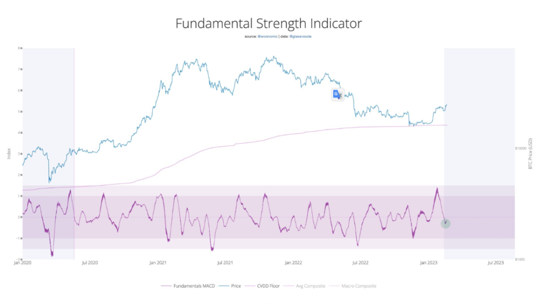 Willy Woo(@woonomic)2月21日发推表示,Bitcoin 的基本面正在回升。Fundamental Strength Indicator不再过热并开始上升(FSI追踪17个基本面和技术指标的强度),如果价格远高于 25k,我们可能会出现轧空。
