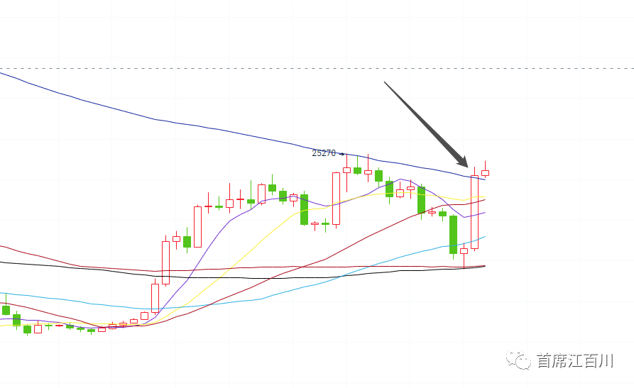 我们再来看看五日线,五日线那是今天收线,强度上虽然很强,但还不够强,如果足够强会直接找黑色86均线去到26500一线附近,既然没去,那么当下的状态,实际上就又可以在继续强势和拖延之间做选择。如果说继续强势的话可以突破黑色86线.相对震荡则可以做记忆唤醒复制一下前面的阳线接小实体阳线玩法,但后续都是以上涨为主。