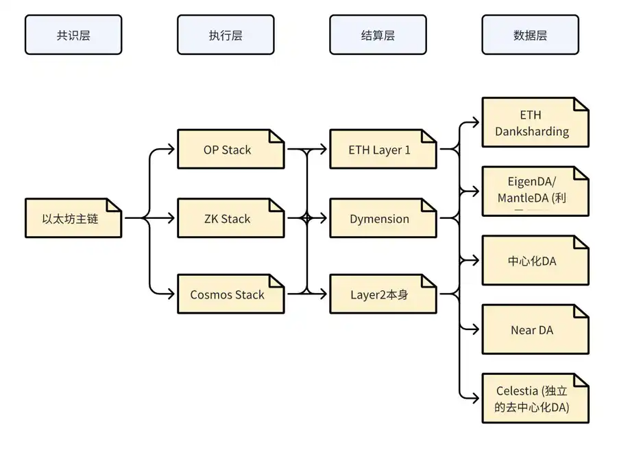 对于以太坊生态来说 未来模块化区块链的可能性数量有 = 执行层方案数量 * 结算层方案数量* DA 层方案数量
