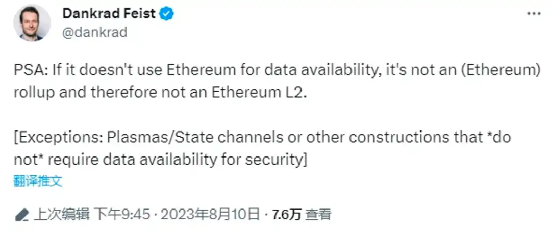 在 Celestia 暴火后,V 神曾暗示「以太坊的 layer2 项目必须要在 ETH 上使用 data availability」。随后以太坊基金会成员 Dankrad Feist 也发表了言论。他指出,不采用 ETH 作 DA 层 (数据可用性层) 的不是 Rollup,也不是以太坊 Layer2。