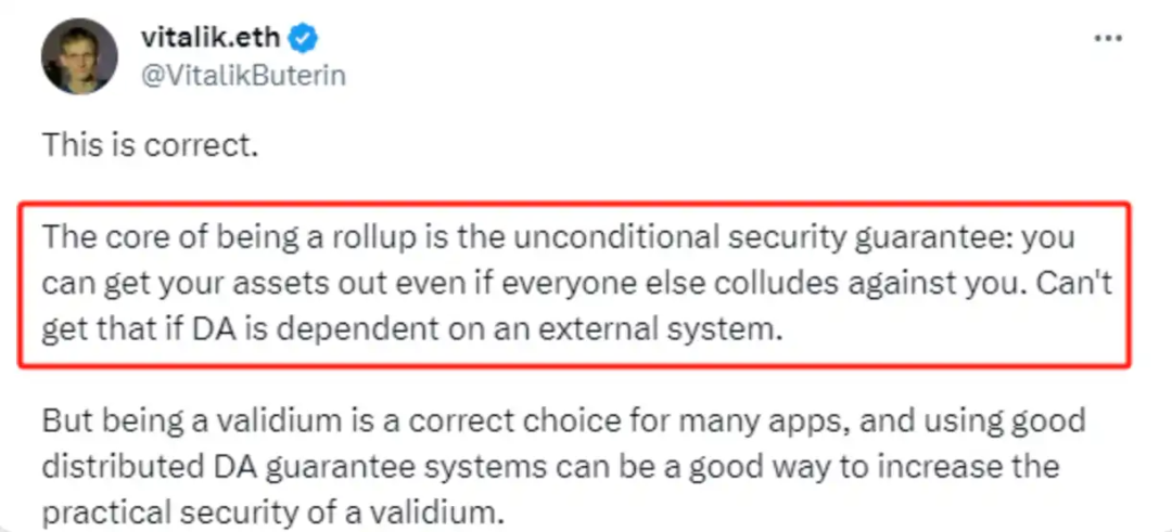 随后 V 神在他的推特流的一次回复中表示「 being a validium is a correct choice for many apps, and using good distributed DA guarantee systems can be a good way to increase the practical security of a validium"