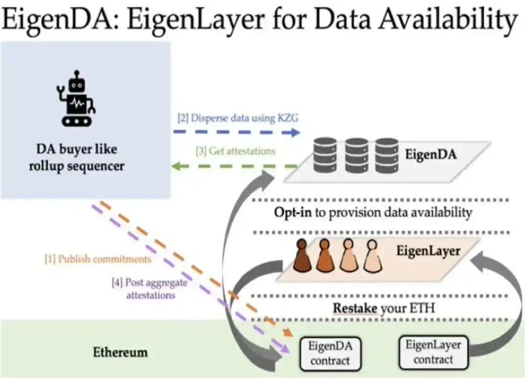 EigenDA 是建立在以太坊上的利用 EigenLayer Restaking 构建的去中心化数据可用性(DA)服务,并将是 EigenLayer 上的首个主动验证服务(AVS)。与 Celestia 或 Avail 不同,EigenDA 不需要引导新的验证器集,以太坊验证者可以自由选择加入。