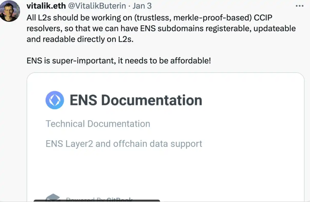 V 神认为若 ENS 的域名解析方案不能覆盖到 Layer2,只停留在以太坊主网层面,很难打开想象空间。基于此背景,V 神在推特中说明 ENS 的重要性,"it needs to be affordable!" .ENS 自然会考虑面向 Layer2 提供一整套的数据解析方案,使得用户可以直接在 Layer2 上进行域名解析和数据查找,减少其对各自 Layer2 偏中心化网关的依赖。