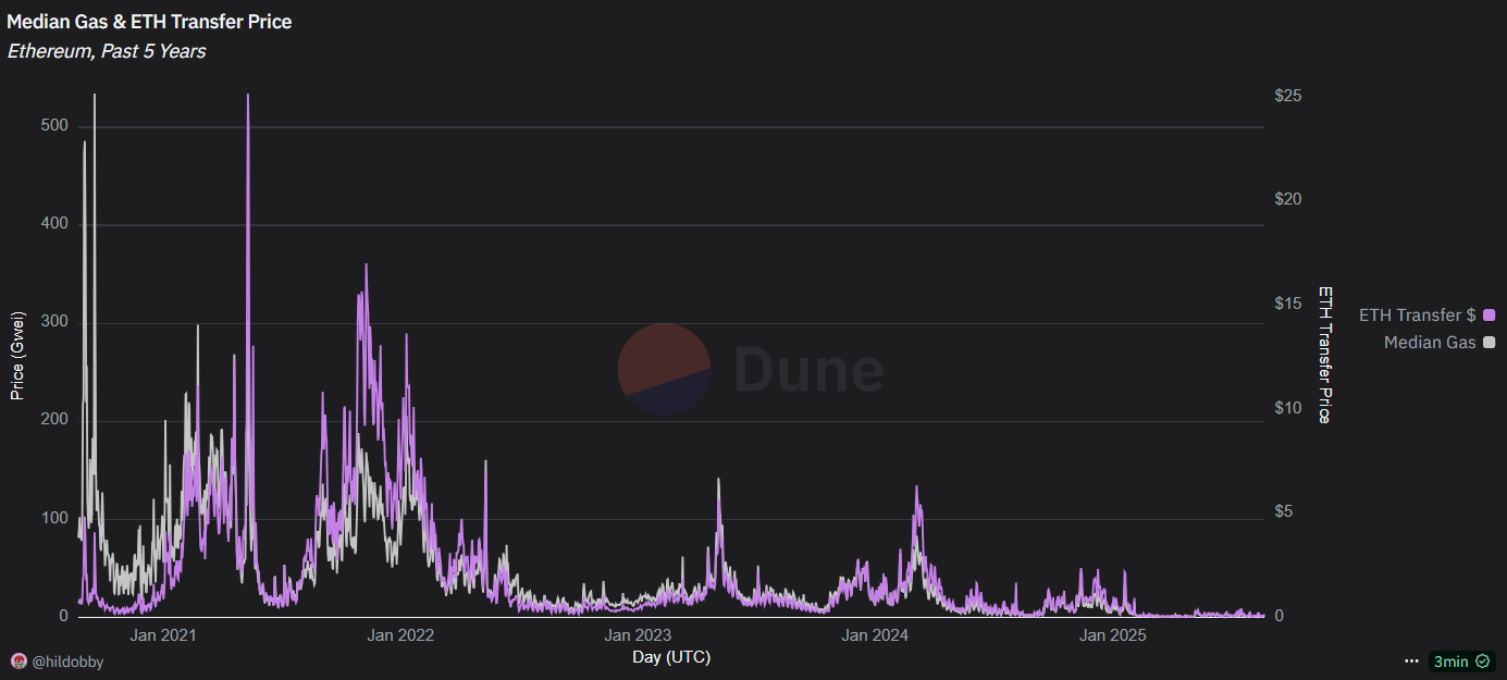 以太坊创历史新高之际 Gas 费用跌至五年低位,日中位数低于 1 gwei