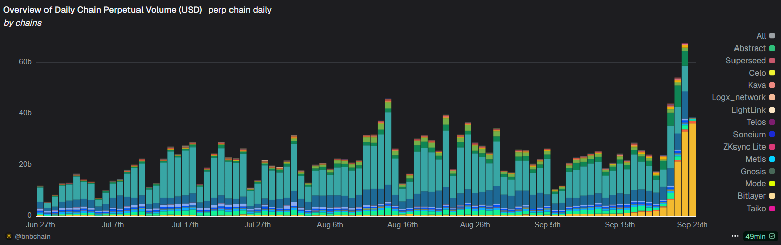 据 bnb chain 数据面板,9 月 24 日,全网 Perp DEX 交易量超过 670 亿美元,连续两天创下历史新高,其中 Aster、Lighter 和 Hyperliquid 均超过了 100 亿美元。 值得注意的是,除了 Hyperliquid 外,日交易量超过 10 亿美元级别的 Perp DEX,包括 Aster、Lighter、edgeX 和 Paradex 的过去 7 天平均交易量均大幅增长,最低增幅亦超过 80%,可能存在刷量行为。