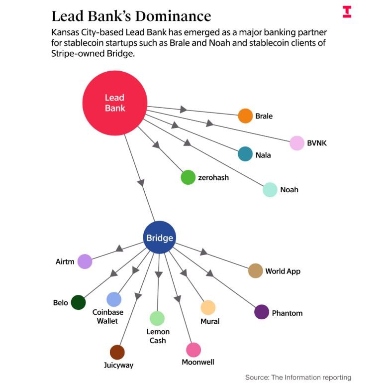 据 The Information 报道,美国堪萨斯城地方银行 Lead Bank 已成为多家稳定币与跨境支付公司的核心银行合作方,包括 Brale、BVNK、Nala、Noah、Zerohash 以及 Stripe 旗下 Bridge。通过 Bridge,Lead Bank 的服务进一步覆盖 Coinbase Wallet、Phantom、World App 等终端应用。市场担忧,稳定币行业在法币入口层面对单一银行的高度依赖,可能带来集中度与系统性风险,一旦该行收紧风控或监管环境变化,或将影响大量加密公司的运营。