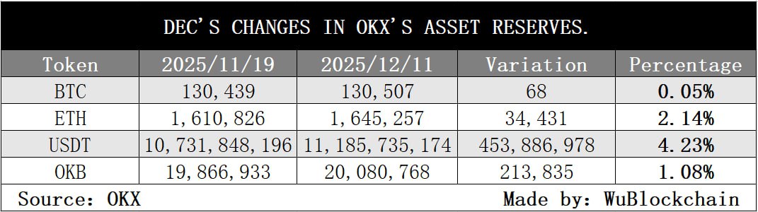 OKX 公布第三十八次资产储备证明(快照日期 12-11)。用户 BTC 资产约为 13 万枚,较上次(11-19) 增长 0.05%, 增长 68 枚 BTC;用户 ETH 资产约为 164.52 万枚,较上次增长 2.14%,增长 34,431 枚 ETH;用户 USDT 资产约为 111.85 亿枚,较上次增长 4.23%, 增长约 4.5 亿枚 USDT。