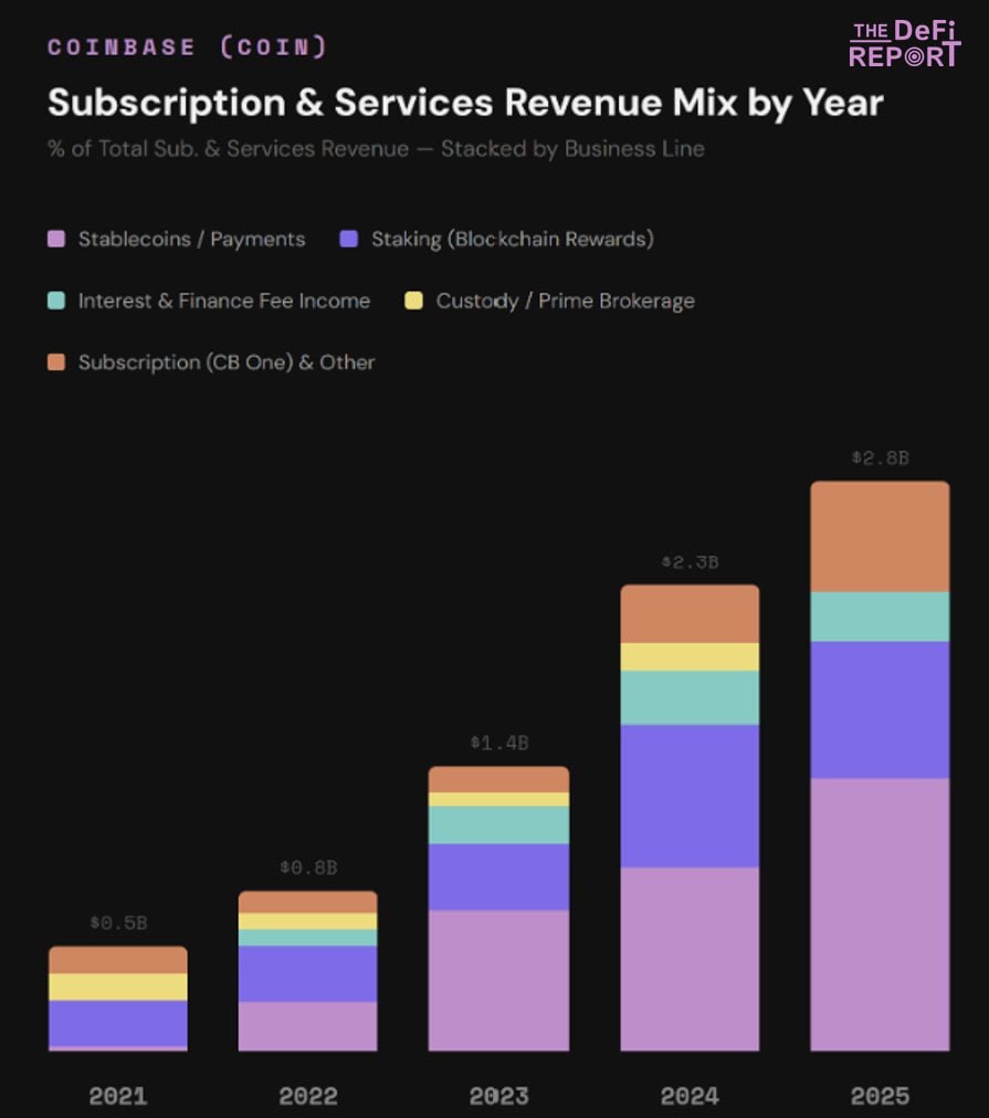 据 The DeFi Report 创始人 Michael Nadeau 披露,尽管零售交易量较 2021 年高点明显回落,但 Coinbase 通过订阅与服务业务实现弥补,其中稳定币相关收入占 2025 年总收入约 19%。其指出,Coinbase 通过与 Circle 的合作,获得平台内 USDC 资产 100% 的利息收入,并分享平台外 USDC 储备收益的 50%,使 Coinbase 产生的稳定币收入已超过 Circle。此外,Coinbase 对新的 USDC 相关合作拥有否决权。