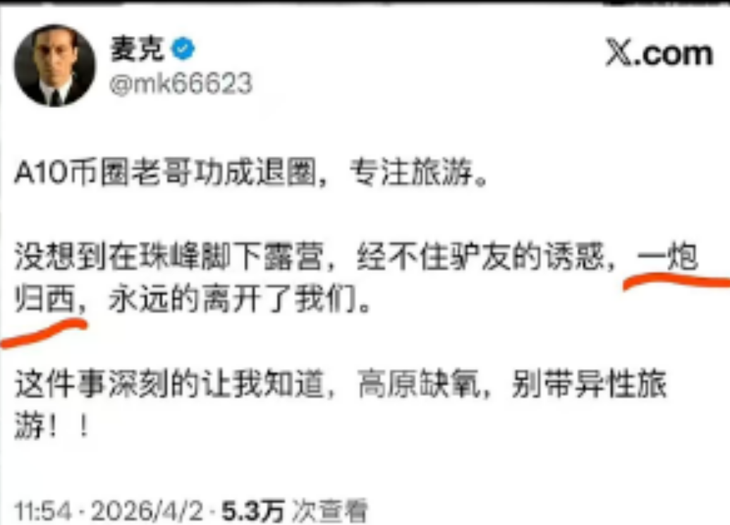 死因既非盗币风波,也不是爆仓危机,而是源于一场在珠峰与异性好友的 “特殊经历”。这位大佬在圈内堪称传奇,其生存之道宛如一门极致的艺术。