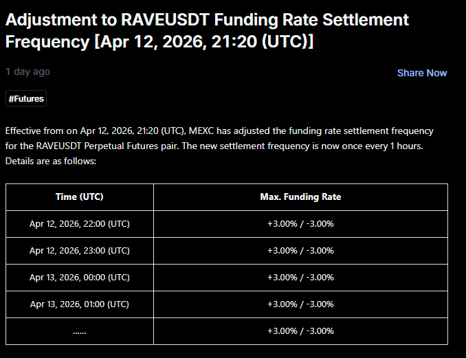 MEXC 在 4 月 12 日把 RAVEUSDT 永续合约的资金费率结算频率调整成每 1 小时一次,并把单次上限调到 +3% / -3%;Bitget 也都在同一天把 RAVEUSDT 的资金费率结算频率从每 4 小时改成每 1 小时,资金费率调整成±2%。