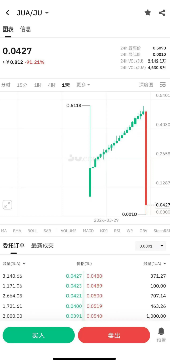 其中,JUA 币的价格走势堪称惨烈,如自由落体般从 0.51 美元直砸至 0.04 美元,几乎归零,让持有该币的投资者欲哭无泪。而平台币 JU 也未能幸免,刹那间再度下跌 30%,其跌幅之迅猛,令投资者们措手不及。