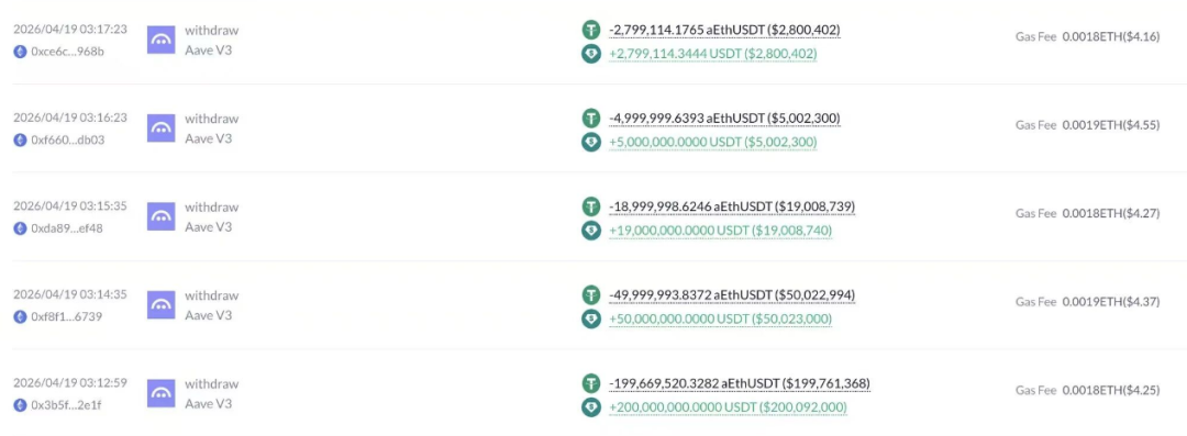 4 月 18 日 18:52 UTC,官方开始冻结所有部署的 rsETH/wrsETH 市场。紧接着,在 19:13、19:14、19:15、19:16、19:17 UTC 这短短几分钟内,HTX Recovery 地址连续从 Aave Pool V3 发起 5 笔提现操作,仅仅 5 分钟,就干脆利落地提走了近 3 亿美金的 USDT,毫不拖泥带水。